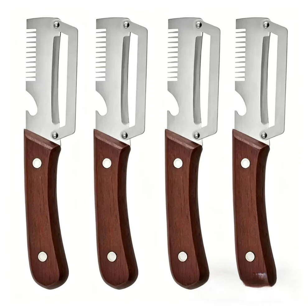 Equipped with a wooden handle and an integrated bottle opener, this vegetable peeler easily handles fruits and veggies with tough skins—such as pumpkins, whitegourd, pineapples, lemons, apples, tomatoes, mangoes, potatoes, carrots, and cucumbers.